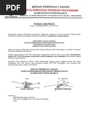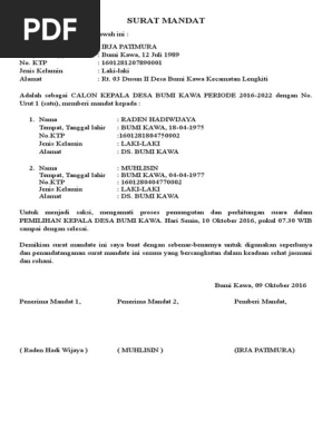 Surat Mandat from imgv2-1-f.scribdassets.com Download contoh surat mandat gerakan pramuka. Download 2075 kb contoh surat mandat saksi pemilu presiden download. Surat kuasa mandat dari calon kepala desa jagamukti kepada saksi dalam pemungutan dan penghitungan suara. 4 downloads 106 views 88kb size. Surat tugas di buat dan di tanda tangani oleh atasan atau pejabat yang berwenang berdasarkan lingkup tugas wewenang dan tanggung jawabnya. Contoh surat mandat dari berbagai instansi. Contoh surat mandat partai yang baik dan benar sebagai referensi pembuatan surat resmi yang profesional. Download contoh surat mandat dengan mengklik link berikut dalam pelaksanaan suatu kegiatan rapat, kita tidak bisa begitu saja mengadakannya tanpa suatu.